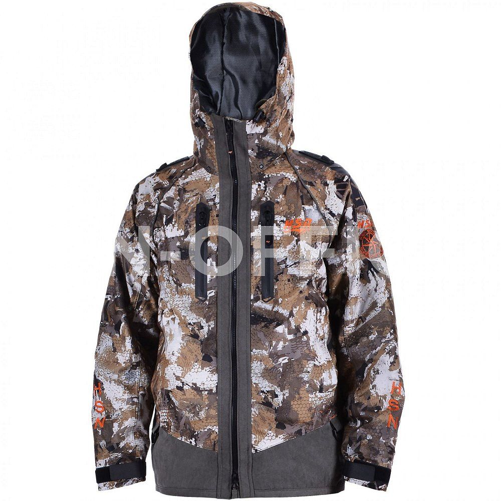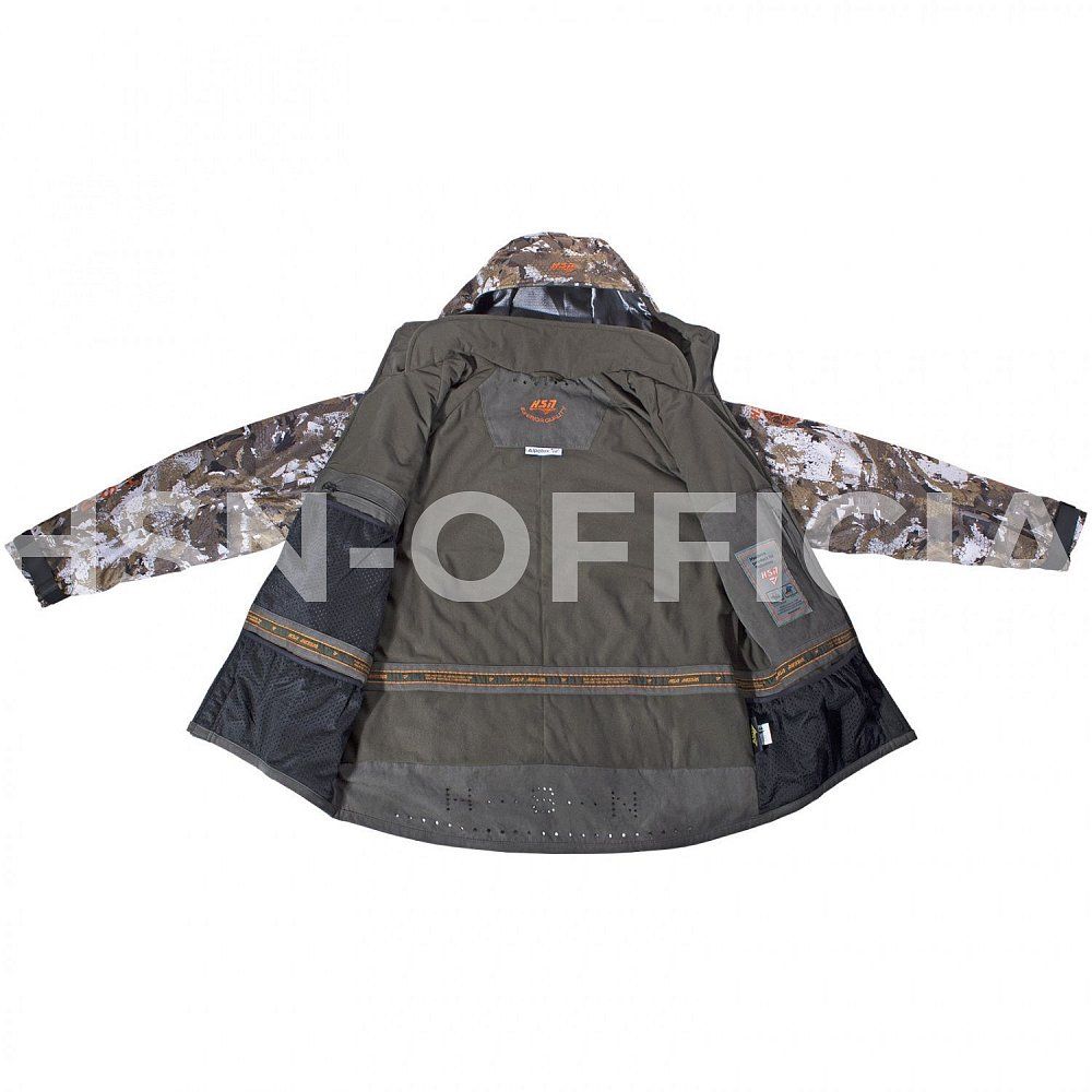 Куртка прямого кроя застегивается на молнию с двумя бегунками, с внутренней ветрозащитной планкой. Капюшон с плотным козырьком регулируется по овалу лица. На плечах противоскользящая стропа для ружейного ремня и т.д. Спинка куртки удлинена для защиты от ветра.
